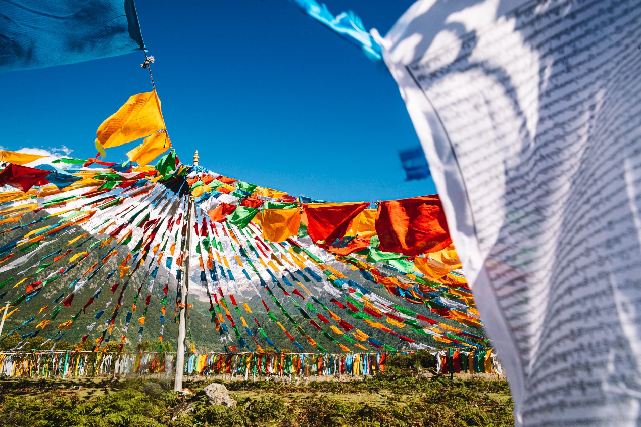 在远眺南迦巴瓦峰的草场上,路虎“发现无止境”车队的队员们在风马旗上提笔留言,让美好的祈愿随着风的脚步在雪域高原上回响。
