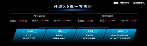 开瑞X6在价格模式上,在行业首推“一口价”定价模式,即全国统一零售价,价格区间从4.69万元至5.39万元;同时提供单排、双排两种车型,标准型、舒适型、豪华型三种配置,满足用户全方位用车需求,让用户实现一步到位的购车新体验。这一方式打破了长期困扰用户的议价烦恼,减少了用户的议价时间成本、沟通成本等,让每一位用户都以最实惠的价格买到心仪车辆,从而实现用户购车满意度的大幅提升。
