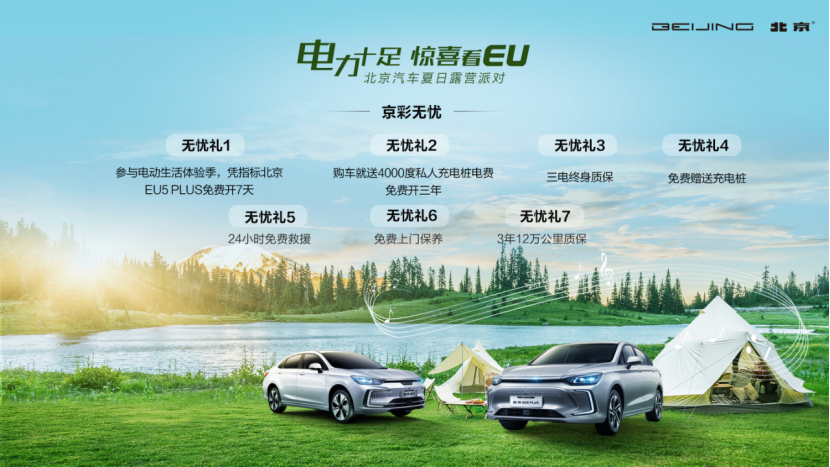 更有参与电动生活体验季,凭指标北京EU5 PLUS可免费开7天等着你。这七天你可以尽情带着家人去体验露营,感受这个季节的美好。相信你开着开着也定会喜欢上这款车,恰逢“京喜”政策提个车,从此只管出发,山川湖海皆可露营!
