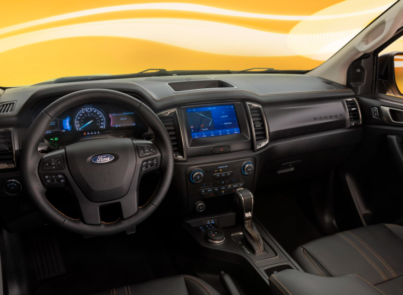 内部配备带有橙色对比色缝线的专属座椅和带有燕尾服条纹的独特碳纹。橙色对比色缝线也出现在方向盘、变速杆上。Lariat型号在前后扶手和仪表板顶部采用橙色重点缝线。