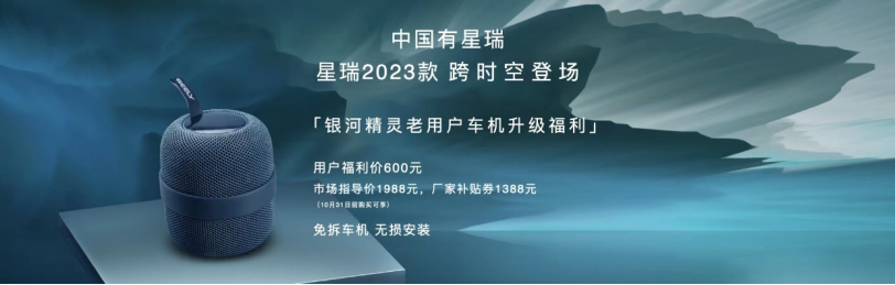除上述礼遇以外,8月31日前订购星瑞2023款“只此青绿版”的用户,还可额外享受价值2000元【只此青绿】文创周边礼包;时空版还推出专属星辰礼包,选装价格为20000元。同时,为感谢星瑞20万用户的信赖与支持,吉利还推出“银河精灵”车机升级福利,可实现免拆车机、无损安装,即可享银河OS智能体验,市场指导价1988元;10月31日前,用户还可以在吉利汽车APP、吉利精品小程序、京东吉利汽车官方旗舰店领取1388元厂家补贴券,只需600元即可获得。