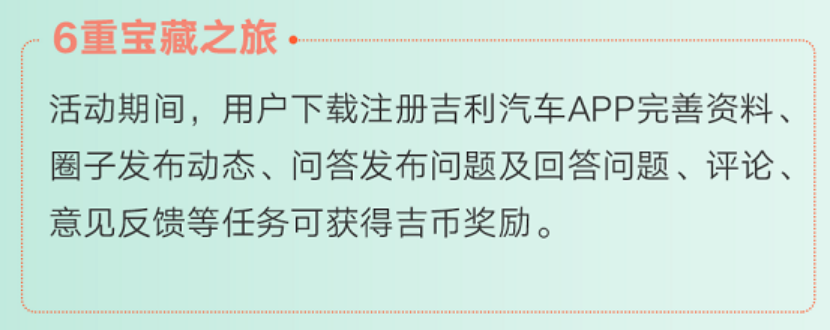 今年5月20日,吉利汽车APP吉币功能更新,新增积分和商城功能,当天还为注册用户发放了520个1314吉币红包。6月活动期间,吉利汽车APP解锁了更多隐藏福利。用户可通过注册、完善资料、发布圈子动态等6重宝藏之旅领取吉币,吉币后续可在吉利汽车APP中兑换相关商品。